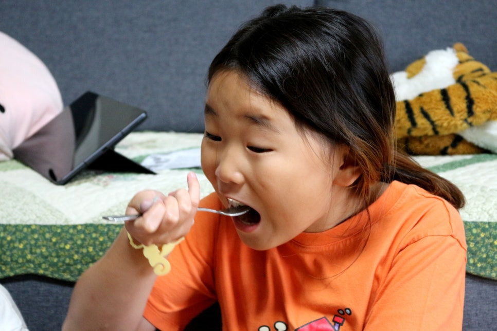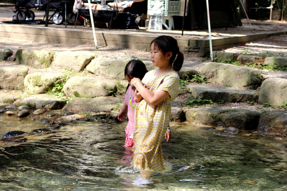 계곡물이라 상당히 차가워서 삼십분쯤 물놀이를 하다 보면 살짝 추위가 느껴진다. 그러면 ‘간식 타임’을 외치고, 텐트로 와서 일단 마른 옷으로 갈아입고 휴식을 취한다. 물론 다시 들어갈 때는 입었던 젖은 옷으로 갈아입는다고 호언장담을 하지만, 옷을 갈아입고서도 잠시도 못 참고 봇도랑 가에서 까불며 놀다가는 역시나....... 풍덩 빠지기 일쑤다.