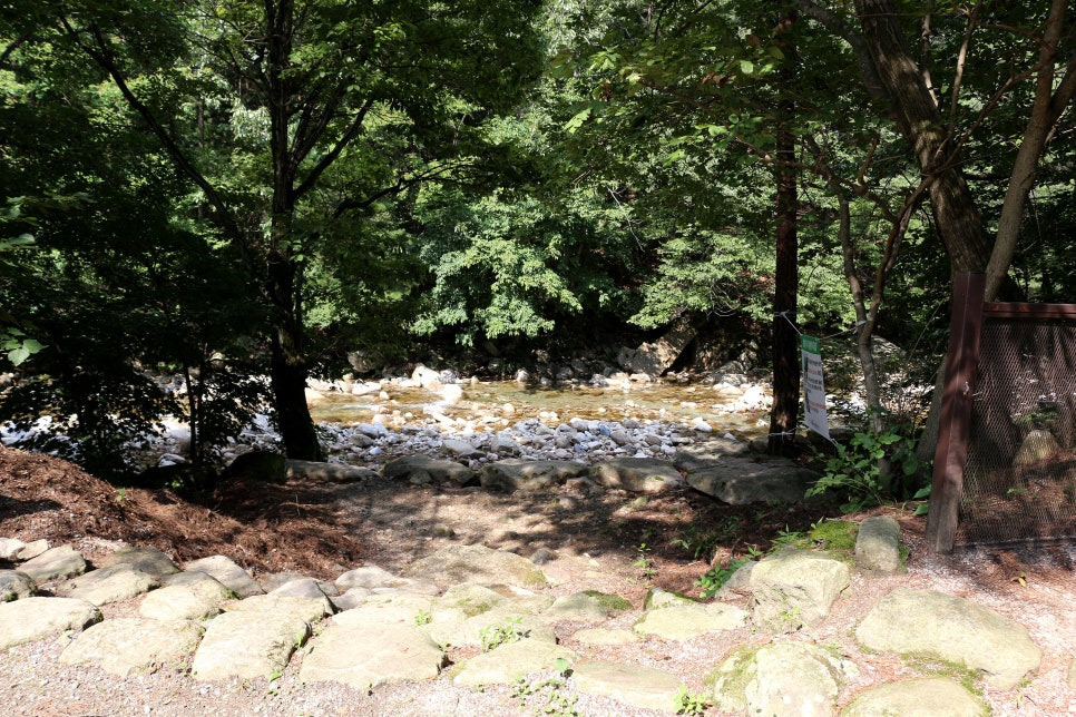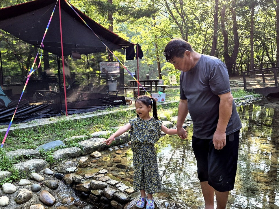 먼저 병아리들과 할머니를 안내해서 (용하 야영장)을 한 바퀴 돌아보면서 우리에게 예약 확정된 A-9 싸이트를 확인시켜 주고 나서 화장실이랑 샤워장과 시설 현황을 안내해 주었다. 우리 싸이트 코앞으로 흘러가는 얕은 봇도랑에 벌써 발을 담구는 병아리들을 데리고 캠핑장 울타리 밖의 계곡을 확인시켜 주었다. 맑은 청정수가 물소리를 내며 계곡을 흘러내리고 있는 것을 확인한 우리 병아리들의 바람은 오로지 지금 당장 풍덩 뛰어들고 싶은 간절함이 가득 담긴 눈길을 할머니에게 보내오고 있다.