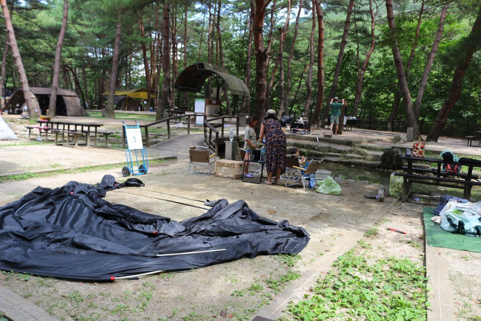 11시 퇴실을 위해선 새벽에 일어나자 마자 벌써 짐꾸릴 궁리부터 하게 만들었다. 비오는 날이나 서리 내리는 계절이 아니더라도, 밤을 지새운 텐트는 어딘가 모르게 눅눅해지기 마련이기 때문이다. 하물며 요즘 추세에 대세인 면텐트의 경우는 마감시에 뽀송뽀송 잘 말리는 것이 더없이 중요하기 때문이다.