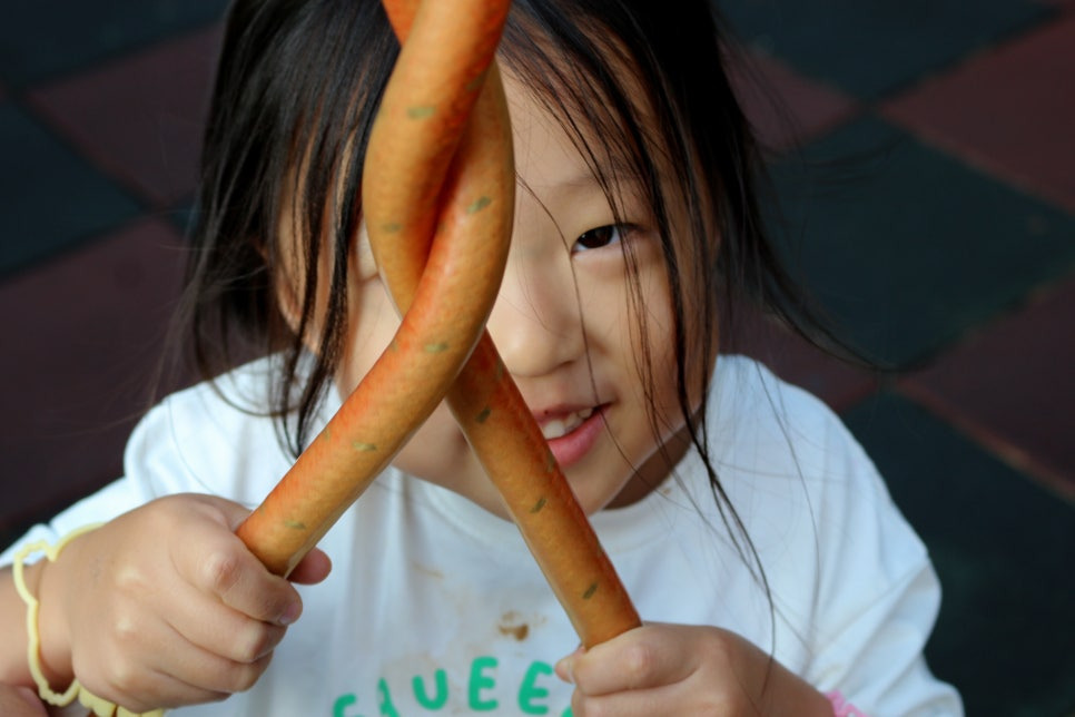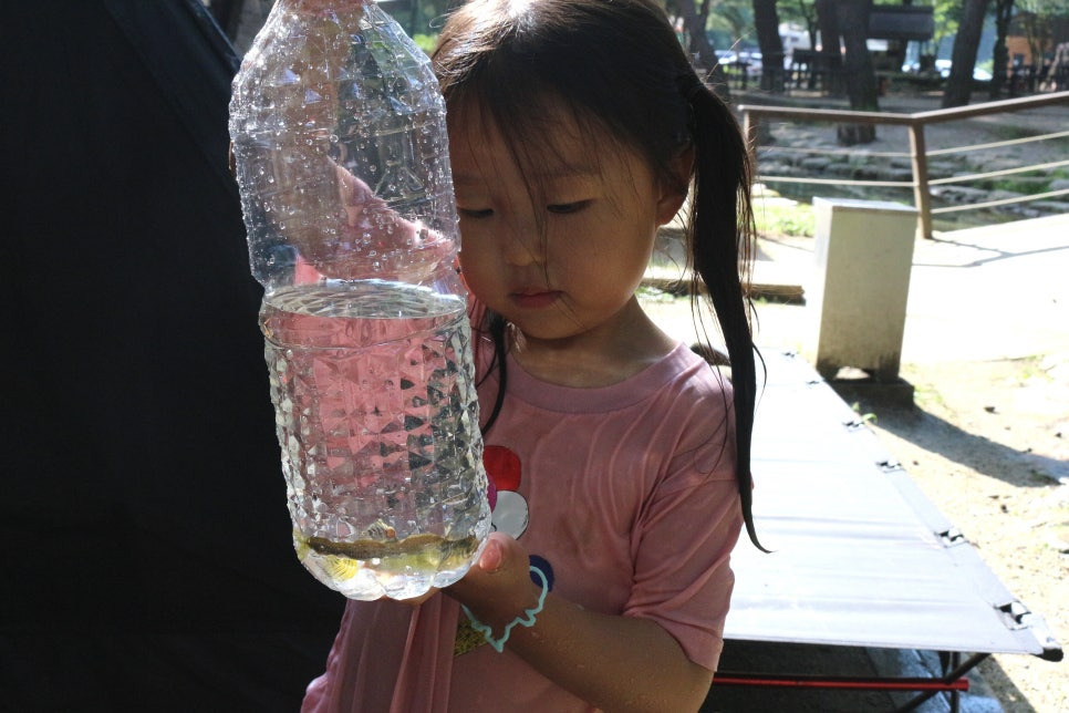그래서 야영장 구석의 재활용 창고에 가서 기웃기웃 맥가이버식 어항을 만들어 볼 요량으로 플라스틱 물병 두 개를 가지고 와서 가위로 잘라 조물락 거리다가 여기저기 구멍을 뚫는다. 녀석들의 신기해하는 눈동자가 빛나고 있다.