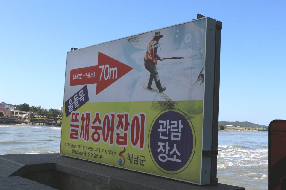 진도대교가 개통되면서, 특히 대교에서 보는 낙조와 야경이 아름답고 다리 아래의 울돌목 물살과 묘한 대조를 이루며 환상적인 장관을 연출해낸다는 소문을 여러 번 접한 바가 있다. 일출과 일몰에 목숨 걸지 말자는 우리 방식의 평소 여행지침에 따라 그냥 지나치려는데, 울돌목은 이충무공의 3대 해전 중의 하나인 명량대첩이 벌어진 장소로 너무나 잘 알려진 해남과 진도 간에 좁은 해협을 이루며 바다의 폭은 한강 너비 정도인 서해로 나아가는 필수 길목이라 들었지 않았던가. 정유재란 당시 이순신 장군이 12척의 배로 330척의 왜선을 무찌른 명량대첩의 전승지가 바로 여기인 것이다. 울돌목이란 "소리를 내어 우는 바다의 길목" 이라는 뜻을 가진 순우리말이고 한자어로 명량(鳴梁)이라 한다. 울돌목의 폭은 294m 정도이나 물살이 세고 소용돌이가 쳐서 그 소리가 해협을 뒤흔들 정도라고, 영화를 통해 그 위력을 절감할 수 있었다.